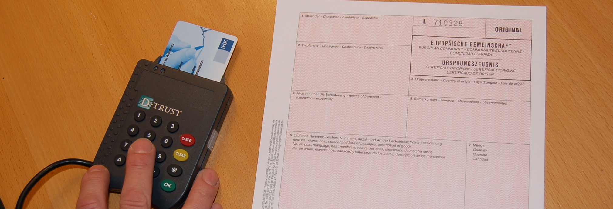 Für Rechtsgeschäfte ist eine verbindliche Unterschrift erforderlich. Dies kann in Papierform mit Unterschrift von Hand oder in elektronischer Form mit der qualifizierten elektronischen Signatur geschehen. Elektronische Signaturanwendungen sind zum Beispiel Ursprungszeugnisse, Emissionshandel, Online-Abwicklung öffentlicher Aufträge, Online-Beantragung eines Mahnbescheids, Elektronisches Abfallnachweisverfahren. Bei einigen Anwendungsfällen ist künftig die digitale Signatur vorgeschrieben. Wer digital unterschreiben möchte, benötigt eine Signaturausstattung. Das ist ein Signaturschlüssel, der sich auf einer Chipkarte befindet, ein Kartenlesegerät und Anwendungssoftware. Registrierungen können in der IHK vorgenommen werden.