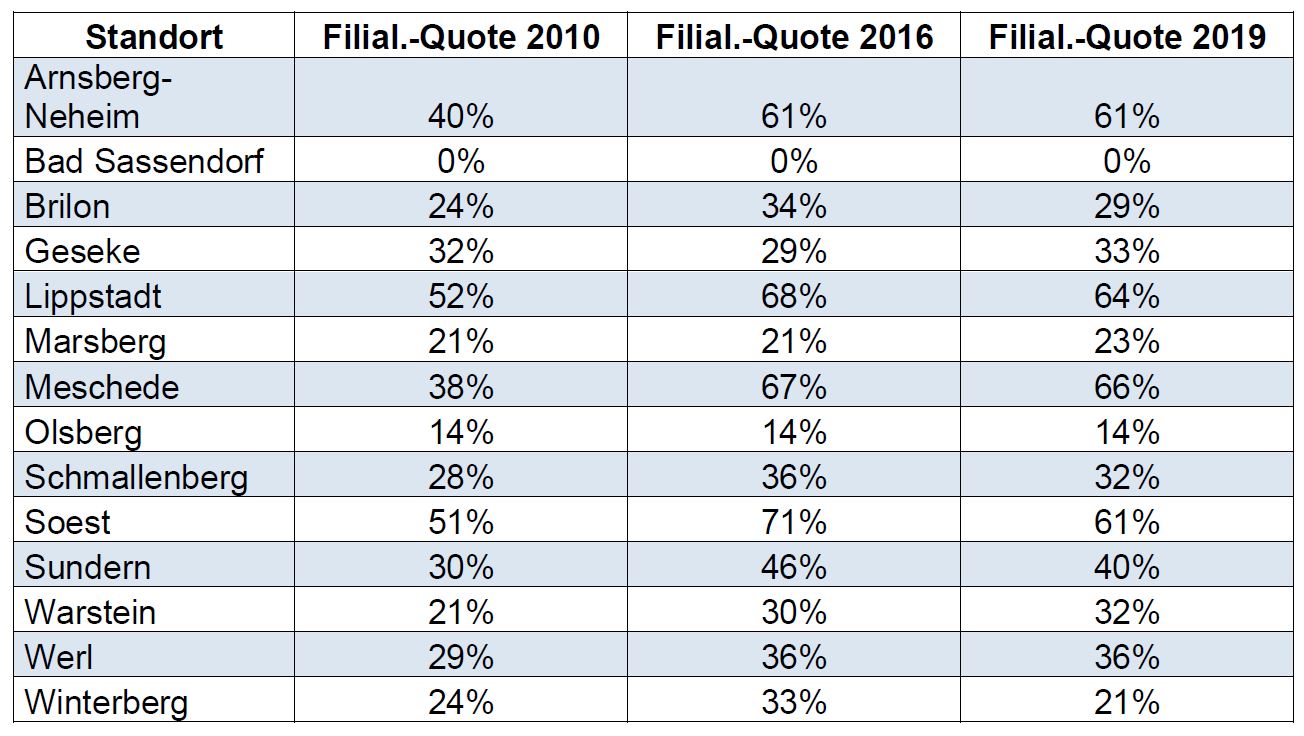 Den Anteil der Filialisten am Gesamtbesatz eines Standortes/einer Fußgängerzone/einer City hat die IHK Arnsberg im Herbst 2019 zum dritten Mal nach 2010 und 2016 erhoben. Insbesondere in den 1A-Lagen der größeren Einzelhandelsstandorte wie Neheim, Lippstadt, Soest und Meschede liegt die Filialisierungsquote nach wie vor bei über 60 %. Allerdings scheint es hier mittlerweile auch zu einer gewissen Sättigung gekommen sein. Nach wie vor eine Ausnahme bildet die Einzelhandelslandschaft im Zentrum des Kurortes Bad Sassendorf, wo nach wie vor kein einziger Filialist zu finden ist.