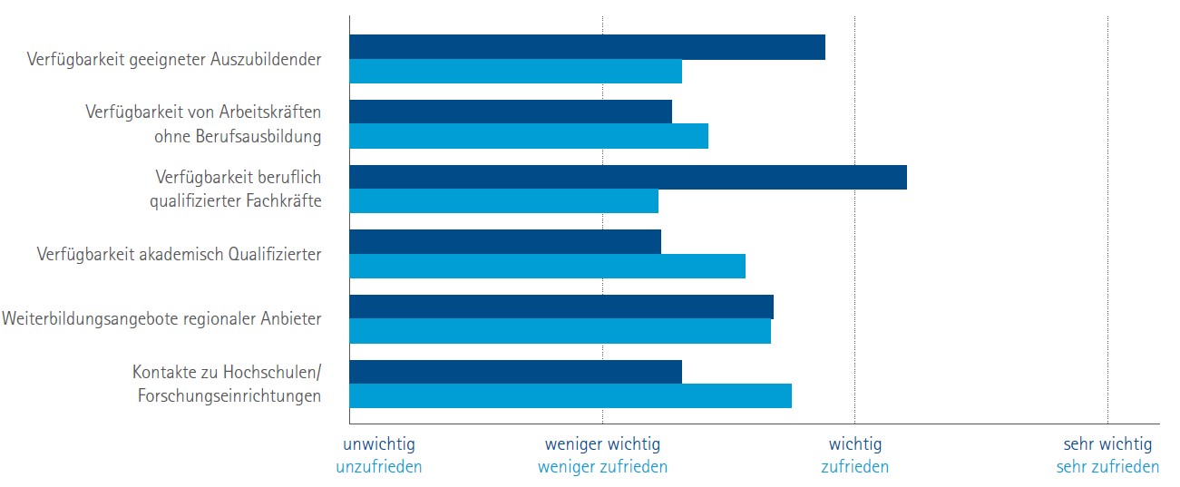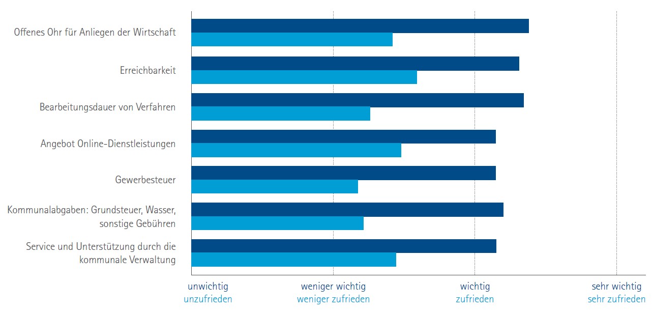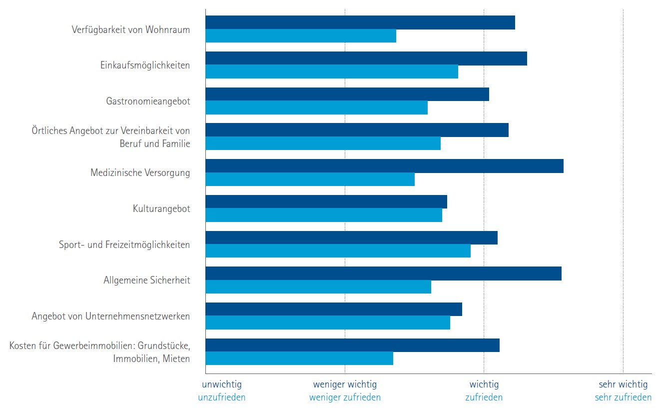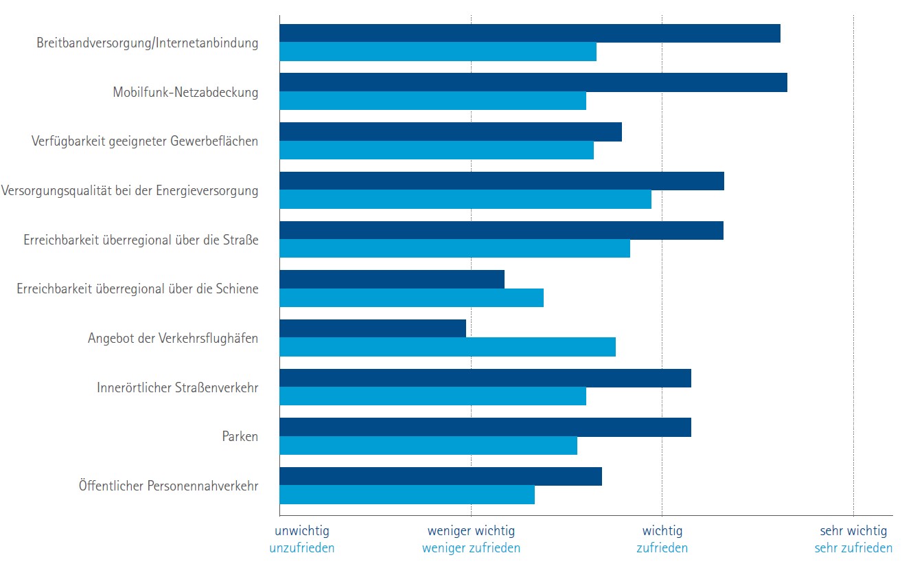 Insgesamt standen 33 Faktoren aus vier Bereichen im Blickpunkt: „Infrastruktur / Verkehr“, „Fachkräfte / Bildung“, „Attraktivität der Stadt / Gemeinde“ und „Verwaltung / Kommunalpolitik“. Die teilnehmenden Unternehmen bewerteten dabei zwei Dimensionen: Wie wichtig ist ihnen dieser Faktor? (Skala von 1 = unwichtig bis 4 = sehr wichtig) und wie zufrieden sind sie damit? (Skala von 1 = unzufrieden bis 4 = sehr zufrieden).