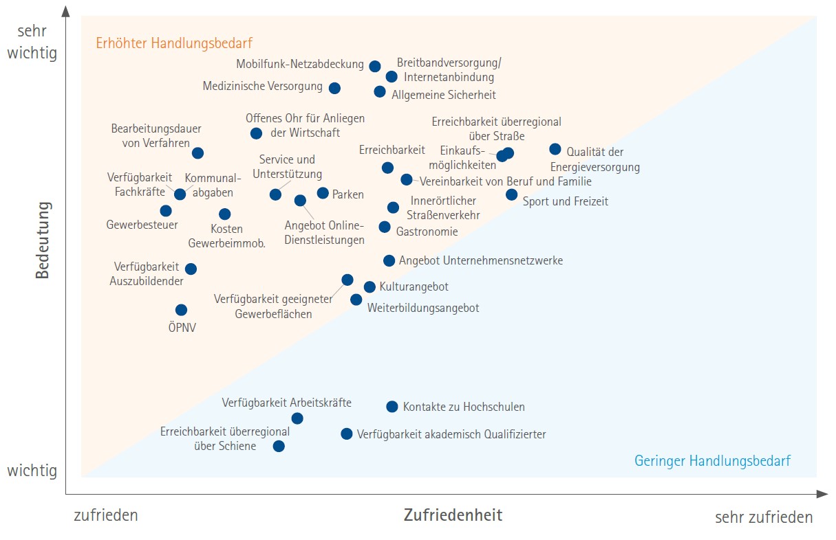 Anhand dieser Bewertungen lassen sich Standortvorteile und Handlungsbedarfe identifizieren: Je größer die Differenz zwischen Bedeutung und Zufriedenheit, desto notwendiger ist eine Verbesserung. Umgekehrt zeigen die Standortvorteile, bei welchen Faktoren eine hohe Relevanz und zugleich eine hohe Zufriedenheit vorliegt. Dies bedeutet jedoch nicht, dass bei diesen Faktoren kein weiterer Verbesserungsbedarf besteht. Ziel sollte sein, diese Standortvorteile zu sichern und weiterzuentwickeln.